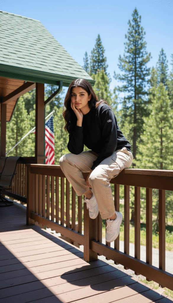 instagramAI Influencer Photo Prompt Generator for TikTok & Instagram8 views0 likes0 copies✏️ Edit prompt before runningMaintain the same face and person, create a hyper-realistic full-body photograph of a young woman with long, voluminous, dark brown wavy hair cascading over her shoulders. She is standing on an outdoor wooden deck on a bright, sunny day, leaning casually back against a brown wooden railing with vertical slats. She has a radiant, wide smile and is looking off to her right, displaying a joyful and relaxed expression. She is wearing a black long-sleeved crop top that shows her midriff, paired with loose-fitting beige cargo pants and clean white chunky sneakers. Her right arm extends to rest on the railing, while her left arm is raised with her hand touching the back of her head, and her legs are crossed at the ankles. The setting is surrounded by a dense forest of tall green pine trees under a vibrant blue sky. Above her, the edge of a roof with dark green shingles is visible. In the background to the left, an American flag is mounted on a pole amongst the trees. The lighting is strong natural sunlight, casting defined shadows on the wooden floorboards of the deck. The image should be 8k high resolution, ultra-detailed, and cinematic, capturing a candid, cheerful vacation atmosphere with sharp focus and vivid colors.1233 charactersCopy PromptShareRun in ChatGPTRun in Gemini