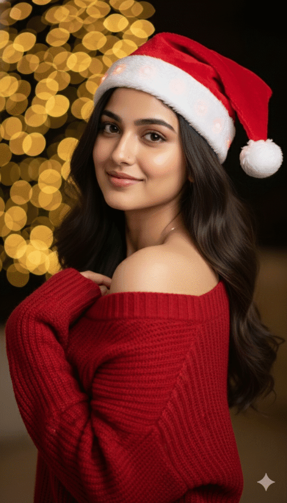 FestivalsBeautiful Christmas Photos Prompt3 views0 likes0 copies✏️ Edit prompt before runningMaintain the same face and person, create a hyper-realistic portrait. A beautiful young woman with fair skin, long, flowing wavy dark brown hair cascading over her shoulders and back, and a warm, gentle smile, looking directly into the camera with soft brown eyes. She is wearing a festive red Santa hat featuring a plush white fur trim that contains subtle, glowing red LED lights, and a cozy, chunky cable-knit off-the-shoulder red sweater. Her pose is intimate, with her body angled slightly away and her bare shoulder visible as she looks over it towards the viewer. The background is a soft, dreamlike bokeh of warm, golden circular lights, creating a magical, festive, and blurred Christmas light effect. The lighting is soft and ambient, emanating from the background and subtly illuminating her, enhancing the cozy and inviting mood. Captured with a 4k quality DSLR, high-resolution, HD high quality, cinematic, shallow depth of field, medium close-up portrait, hyper-realistic.986 charactersCopy PromptShareRun in ChatGPTRun in Gemini