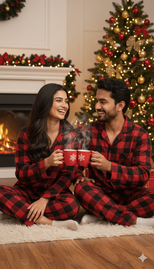 ChristmasChristmas AI Prompts Generator Prompt2 views0 likes0 copies✏️ Edit prompt before runningMaintain the same faces and persons, create a hyper-realistic portrait of a happy, smiling couple, a man and a woman, both wearing matching cozy red and black buffalo plaid pajamas, seated cross-legged on a light, fluffy white rug on a warm wooden floor. They are positioned facing each other, slightly turned, and are clinking two identical red ceramic mugs, each adorned with a white snowflake design, with visible steam gracefully rising from the hot beverages. The man has a warm, broad smile and a charming gaze towards the woman, while the woman is captured mid-laugh, her eyes playfully crinkled and a wide, joyous smile on her face. The man has short, neatly styled brown hair and light stubble, while the woman has long, wavy brown hair flowing over her shoulders, with natural, subtle makeup. Behind them, to the right, stands a beautifully decorated Christmas tree, aglow with warm golden lights and adorned with red and gold baubles and ribbons. To the left, a cozy fireplace with a roaring fire casts a warm glow, its mantle decorated with festive green garland and more string lights. The scene is bathed in soft, warm, inviting light, creating a festive, intimate, and cheerful atmosphere, captured in a medium shot, eye-level perspective, with 4k quality DSLR, hyper-realistic, high-resolution, HD high quality, cinematic detail.1345 charactersCopy PromptShareRun in ChatGPTRun in Gemini