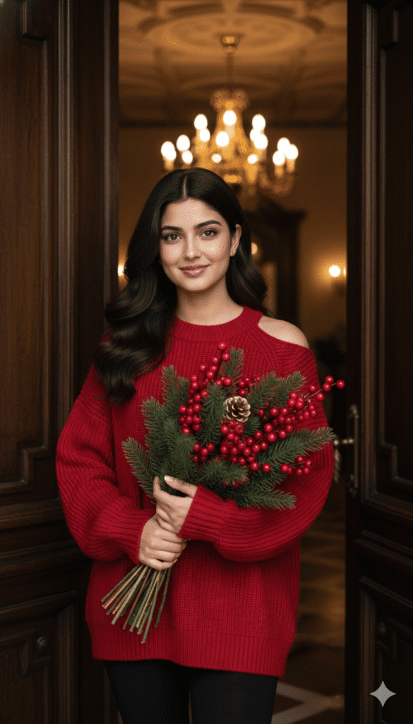 ChristmasChristmas AI Prompts Generator2 views0 likes0 copies✏️ Edit prompt before runningMaintain the same face and person, create a hyper-realistic portrait. A beautiful young woman with long, lustrous dark wavy hair and a warm, inviting smile looks directly at the viewer. She wears an oversized, thick, ribbed knit red sweater with a dropped shoulder design and black leggings. She holds a large, vibrant, festive bouquet composed of dark green evergreen branches, numerous bright red berries, and a small pinecone, clasped gently in her hands. She stands elegantly in an ornate dark doorway, with a grand, dimly lit interior hallway featuring a decorative ceiling and an elaborate gold chandelier with warm glowing lights visible through the open door on the right, creating a sense of luxury and depth. The lighting is soft and even on her face, contrasting with the moodier, warmly lit background. Shot as a medium, head-on composition, captured with 4k quality DSLR, hyper-realistic, high-resolution, HD high quality, cinematic.946 charactersCopy PromptShareRun in ChatGPTRun in Gemini
