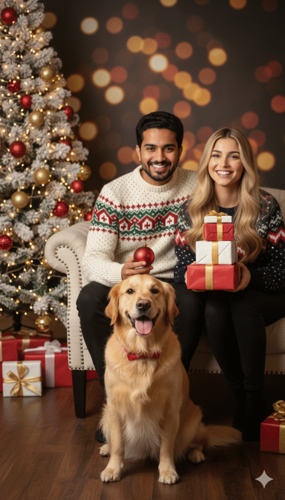ChristmasChristmas AI Prompts Generator2 views0 likes0 copies✏️ Edit prompt before runningMaintain the same face and person, create a hyper-realistic portrait of a smiling couple and their dog, 4k quality DSLR, hyper-realistic, high-resolution, HD high quality, cinematic. A blonde woman with long, slightly wavy hair, wearing a dark festive patterned sweater, holding a stack of small red and white wrapped Christmas gifts, stands next to a bearded man with short dark hair. The man, wearing a cream-colored festive patterned sweater with a distinctive red and green mountain/house design, is seated on a light-colored sofa, holding a single red Christmas ornament. Both the woman and man are smiling warmly and looking directly at the camera, exuding joy. In the foreground, a happy Golden Retriever sits patiently on a dark wooden floor, looking at the camera with its tongue slightly out, adorned with a red festive collar and bow tie. The cozy indoor Christmas setting features a beautifully decorated Christmas tree on the left, adorned with warm lights, red, gold, and white ornaments, some with a touch of snow flocking. The background is a soft, warm bokeh of golden lights against a dark wall, creating a magical and inviting atmosphere. Numerous red and white wrapped Christmas presents with elegant gold and red bows are scattered on the wooden floor around the subjects. Soft, warm, ambient lighting casts a festive glow, enhancing the cozy and joyful mood of the scene. The composition is an eye-level medium shot, focusing on the intimate interaction of the family, with the festive decorations filling the frame.1538 charactersCopy PromptShareRun in ChatGPTRun in Gemini