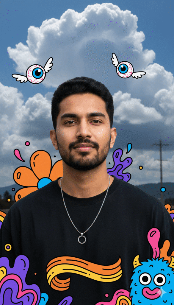 instagramMixed-Media Cinematic Portrait with Doodle Art2 views0 likes0 copies✏️ Edit prompt before runningMaintain the same face and person, create a hyper-realistic mixed-media portrait of a young Asian male in his early 20s with short, textured black hair featuring faded sides. He has a calm, neutral expression and is looking slightly upward, wearing a loose-fitting plain black t-shirt and a thin silver chain necklace with a circular ring pendant. The image is a creative fusion of high-quality photography and vibrant, cartoonish “doodle art” illustrations that surround and interact with the subject. The doodle overlay features thick-lined, colorful vector elements including two flying eyeballs with wings at the top, large rounded flowers in purple, blue, orange, and yellow, and abstract cloud-like swirls. A stylized, wavy orange and yellow flame-like ribbon wraps around his torso in the foreground, creating depth. To the bottom right, a blue furry monster character with large white eyes and pink lips is visible among the colorful shapes. The background is a realistic outdoor setting featuring a dramatic sky filled with massive, detailed white and grey cumulus clouds, with faint silhouettes of utility poles and hills in the lower distance. The lighting is natural daylight, casting soft shadows on the subject’s face, contrasting with the flat, bright colors of the artwork. Use keywords like 4k quality, ultra-detailed, photo manipulation, grime art style, vector overlay, cinematic composition, sharp focus, and vibrant color palette.1469 charactersCopy PromptShareRun in ChatGPTRun in Gemini