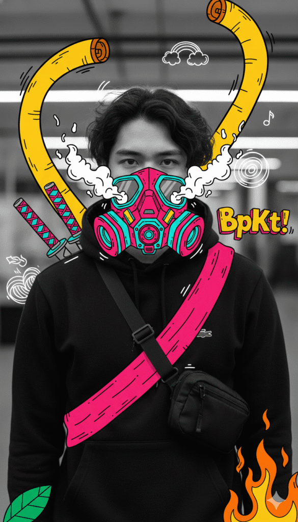 instagramCyberpunk Grime-Art Portrait in Black & White7 views0 likes0 copies✏️ Edit prompt before runningMaintain the same face and person, creating a mixed-media composition that blends a hyper-realistic black and white photograph with vibrant, colorful vector-style doodle art overlays in a “grime art” aesthetic. The subject is a young Asian man with messy, wavy, center-parted dark hair and a neutral, direct gaze, wearing a black hoodie with a visible black crossbody bag strap. His nose and mouth are completely covered by an elaborate, digitally illustrated mechanical cyberpunk gas mask in bright pink, red, cyan, and white, designed to look like a complex engine block with pipes and filters. Surrounding him are various colorful, flat-style cartoon elements: large yellow curved tubes or scrolls behind his head, two illustrated katana sword handles with pink and cyan geometric patterns protruding from behind his left shoulder, and a thick, textured pink sash drawn diagonally across his chest. Stylized white smoke plumes with black outlines rise from the mask, mixed with white line-art cloud scribbles and floating circles. In the bottom right corner, yellow and orange cartoon flames rise up, while a green illustrated leaf sits in the bottom left. Graffiti-style yellow text reading “BpKt!” with black drop shadows floats on the right side. The background is a blurry, grayscale indoor setting, emphasizing the high contrast between the monochrome photography and the saturated, neon-colored digital illustrations, 4k quality, sharp focus, urban street art style.1499 charactersCopy PromptShareRun in ChatGPTRun in Gemini