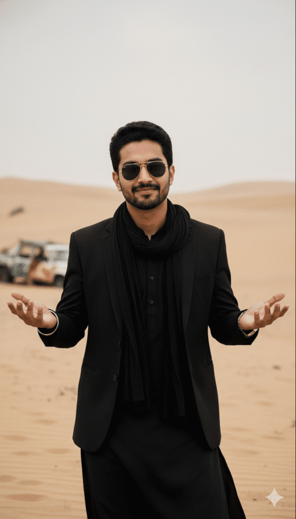 BollywoodDhurandhar Akshaye Khanna Look – Desert Portrait13 views0 likes0 copies✏️ Edit prompt before runningMaintain the same face and person, create a hyper-realistic portrait. A man with dark, styled wavy hair and gold-framed aviator sunglasses, wearing a traditional black full-sleeved kurta under a sharp black blazer, with a matching black scarf draped around his neck. He stands with a knowing, slightly mischievous smirk, his head tilted subtly, as he gestures outwards with both hands, palms open in a classic shrug. Silver bracelets adorn his left wrist. The scene unfolds in a vast, arid desert landscape with soft, undulating sand dunes in the distant background under a muted sky, while hints of abandoned, distressed vehicles are visible to his left. The lighting is natural and even, highlighting his confident posture. This is a cinematic, 4k quality DSLR, hyper-realistic, high-resolution, HD high quality medium shot, captured at eye-level.849 charactersCopy PromptShareRun in ChatGPTRun in Gemini