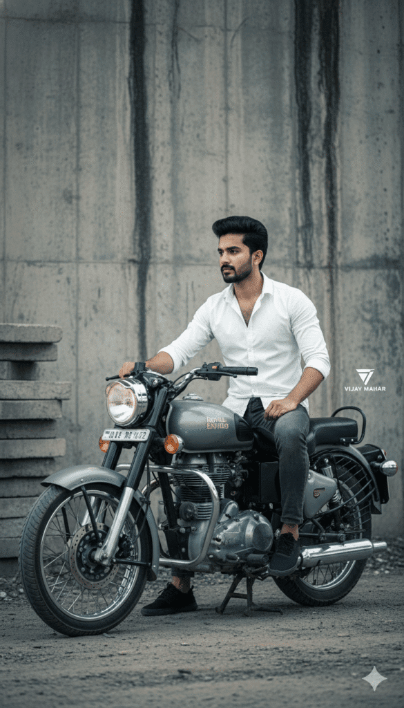 Men PhotographyGemini Bullet AI Photo Prompt Generator – Create Stunning Bullet Bike Images7 views0 likes0 copies✏️ Edit prompt before runningMaintain the same face and person, create a hyper-realistic portrait of a handsome young man sitting on a motorcycle in a moody, industrial setting. The man has a fair complexion, a sharp jawline, and a thick, well-groomed dark beard and mustache. His hair is dark, styled in a voluminous, textured, wind-swept quiff with shorter sides. He is wearing a white button-down shirt, unbuttoned at the top to reveal his chest, with sleeves rolled up to the elbows, paired with dark grey or black slim-fit jeans and black sneakers. He sits casually on a gunmetal grey Royal Enfield Classic motorcycle, with his right hand resting on the handlebar grip and his left hand resting on his left thigh. He is looking off to the left with a serious, contemplative expression. The motorcycle features the text “ROYAL ENFIELD” clearly on the matte grey fuel tank, spoked chrome wheels, a black exhaust, a split black leather seat, and a visible license plate on the rear fender. The background consists of a tall, textured concrete wall with vertical water stains, suggesting an underpass or bridge environment. To the left, there is a stack of rough concrete slabs. The ground is uneven dirt and gravel. The lighting is soft and diffused, characteristic of an overcast day or shaded area, creating a desaturated, cinematic, and gritty atmosphere with cool tones. A small white triangular logo with the text “VIJAY MAHAR” is visible on the right side. 4k quality DSLR, ultra-detailed, high-resolution, sharp focus on the subject, cinematic composition.1560 charactersCopy PromptShareRun in ChatGPTRun in Gemini