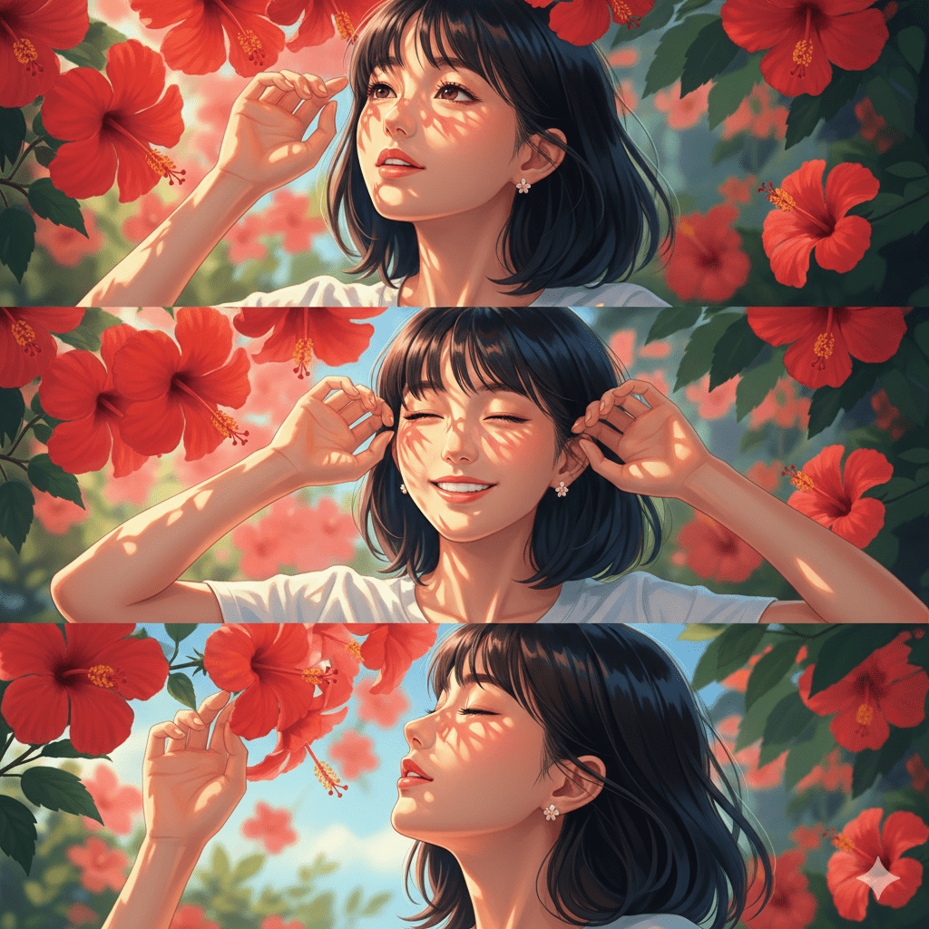 instagramHibiscus Light Anime Triptych Illustration8 views0 likes0 copies✏️ Edit prompt before runningMaintain the same face and person, create a vertical triptych collage consisting of three highly detailed, cinematic panels featuring a young woman in a semi-realistic anime art style, surrounded by vibrant red hibiscus flowers and lush greenery. The character is a young Asian woman with shoulder-length dark hair, wispy bangs, and fair, glowing skin, wearing a simple white t-shirt and small flower-shaped earrings. Throughout all panels, emphasize the effect of dappled sunlight (komorebi) casting intricate leaf shadows across her face and body, creating a warm, summery, and ethereal atmosphere. In the top panel, depict a close-up three-quarter view where she looks serenely upward to the right, lips slightly parted, with one hand raised near her ear, framed by a canopy of red flowers above. In the middle panel, show a front-facing shot of her smiling broadly with eyes closed in pure delight, hands gently raised near her ears, set against a soft, sun-drenched background of coral and pink floral hues. In the bottom panel, illustrate her in profile with her head tilted back and eyes closed, basking in the sun, while her hand reaches up to touch a branch of red hibiscus flowers extending from the left, against a backdrop of soft blue sky and blurred green leaves. The overall style should be a high-quality digital painting with vibrant colors, smooth shading, sharp focus on the facial features, and cinematic lighting reminiscent of high-end studio animation, 4k quality, ultra-detailed, photorealistic lighting in an illustrative medium.1561 charactersCopy PromptShareRun in ChatGPTRun in Gemini