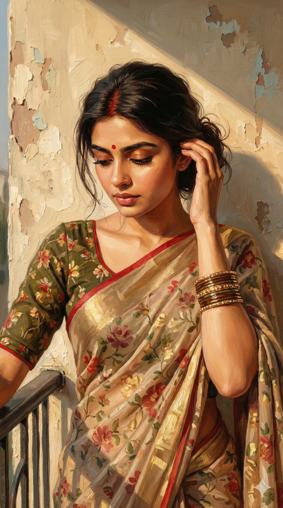 Digital IllustrationHyper-Realistic South Asian Woman Digital Art in Golden Hour Painterly Style10 views0 likes0 copies✏️ Edit prompt before runningMaintain the same face and person, create a hyper-realistic portrait in a highly detailed painterly digital art style of a young South Asian woman standing in a sun-drenched setting. The woman has a serene, contemplative expression with her eyes cast downward and slightly closed. She has fair skin, a small red bindi on her forehead, and red sindoor in the part of her dark, wavy hair, which is pulled back into a loose, messy low bun secured with a red fabric accessory, with loose wisps framing her face. She is wearing a traditional beige saree with an orange and red floral print and subtle gold sheen, draped over a dark olive green floral blouse with red trim. Her right hand is raised, gently touching her hair near her temple, adorned with a stack of gold and brown bangles, while she wears gold dangling earrings and a thin gold necklace. The background is a textured, weathered beige wall with peeling paint and rough plaster, featuring a sharp diagonal shadow line cast by strong golden hour sunlight. The light hits the woman’s face and upper body, creating a warm, glowing atmosphere. To the bottom left, a dark metal railing structure is visible against the wall. The image features a thick impasto brushstroke texture, blending realistic proportions with an aesthetic, illustrative style similar to high-quality anime background art or oil painting, 8k resolution, cinematic lighting, warm color palette, ultra-detailed, masterpiece.1455 charactersCopy PromptShareRun in ChatGPTRun in Gemini