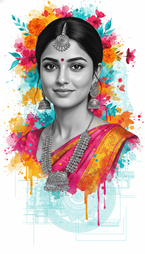 Digital IllustrationHyper-Realistic South Asian Woman Portrait with Traditional Jewelry & Watercolor Art10 views0 likes0 copies✏️ Edit prompt before runningMaintain the same face and person, create a hyper-realistic portrait illustrating a stunning South Asian woman in a highly stylized, mixed-media digital art piece. The artwork features a striking contrast between the subject’s face, which is rendered in high-contrast black and white greyscale with realistic shading and smooth gradients, and the vibrant, colorful surroundings. The woman is positioned with her head tilted horizontally, lying down or rotated 90 degrees, occupying the central and upper portion of the frame. She has sharp, defined features, a small red bindi on her forehead, and an intense, captivating gaze looking directly at the viewer. She is adorned in heavy, traditional oxidized silver jewelry, including a delicate maang tikka along her hairline, large intricate earrings with hanging beads, and a layered heavy necklace. Her hair is dark, sleek, and pulled back. She is draped in a brightly colored garment or saree featuring dynamic splashes of hot pink, saffron orange, yellow, and teal blue, rendered with a loose, painterly, watercolor texture. The upper background explodes with colorful floral elements, including bright orange marigolds and red blossoms, interwoven with abstract teal leaf shapes and watercolor ink splatters. The lower portion of the image fades into a stark white background overlaid with intricate, fine-line cyan-blue sketches. These sketches resemble architectural blueprints or ancient technical drawings, featuring a large, detailed circular mandala pattern and faint outlines of traditional structures and motifs. The overall aesthetic is a sophisticated collage blending photorealistic vector portraiture, vibrant watercolor expressionism, and technical line art, high resolution, 4k quality, artistic and cultural atmosphere.1793 charactersCopy PromptShareRun in ChatGPTRun in Gemini