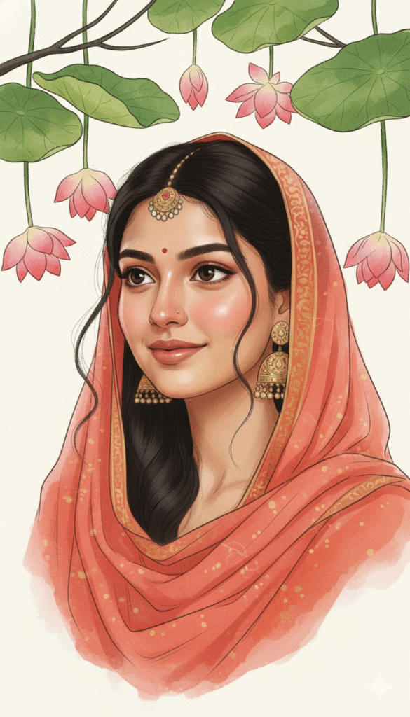 Digital IllustrationHyper-Realistic South Asian Woman Portrait | Digital Illustration Art5 views0 likes0 copies✏️ Edit prompt before runningMaintain the same face and person, create a hyper-realistic portrait digital illustration of a young South Asian woman with a captivating, gentle expression. She has large, expressive almond-shaped dark eyes looking slightly to the side with a soft gaze, defined arched eyebrows, and full lips curved into a subtle, sweet smile. Her skin has a warm, glowing complexion with rosy blush on her cheeks and nose tip, and she wears a small red circular bindi on her forehead. Her dark, wavy hair is loosely styled with wispy strands framing her face, partially covered by a vibrant coral-orange dupatta or veil with subtle gold textures and borders draped over her head and shoulder. She wears a large, intricate traditional gold jhumka earring with dangling beads and a hair ornament visible near the hairline. The composition is framed artistically by hanging pink lotus flowers and large, round green lily pad leaves suspended from dark, thin branches above her, creating a natural canopy. The art style is a blend of realistic character design and watercolor aesthetics, characterized by fluid brushstrokes, soft shading, and defined ink-like outlines. The background is a clean, flat off-white or cream color. The lighting is soft and cinematic, highlighting her cheekbones and the bridge of her nose, creating an ethereal, romantic atmosphere. Key descriptors: 8k resolution, ultra-detailed, digital painting, masterpiece, aesthetic, painterly texture, traditional attire, serene mood.1486 charactersCopy PromptShareRun in ChatGPTRun in Gemini