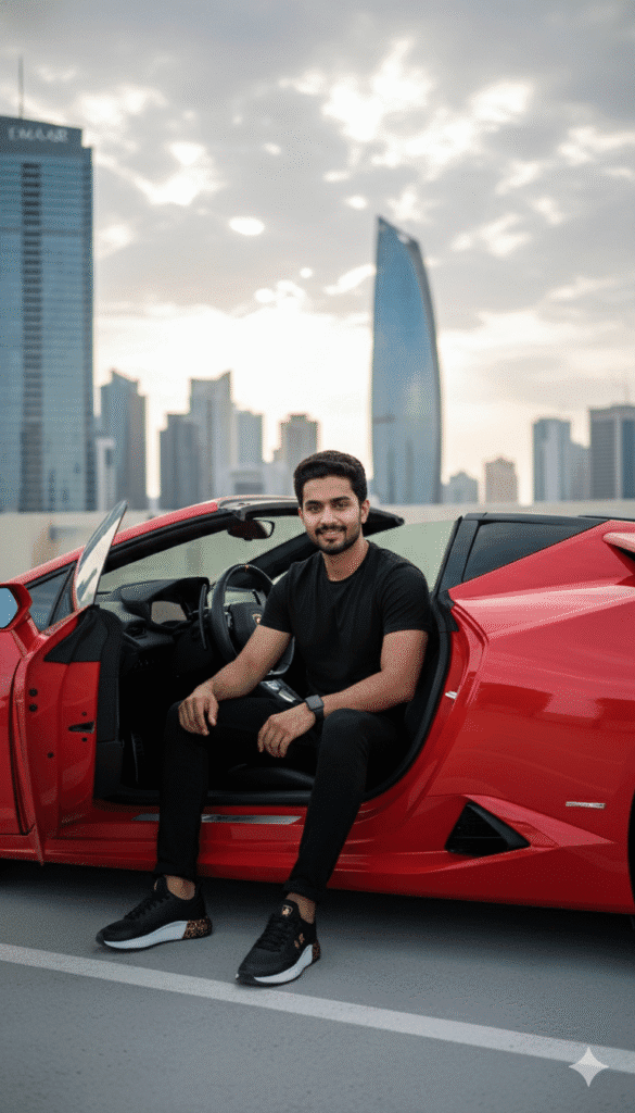 Men PhotographyMen Ferrari Photo Wallpaper – Stylish HD Ferrari Images for Men3 views0 likes0 copies✏️ Edit prompt before running100% matching with the same face and person, create a hyper-realistic lifestyle portrait of a handsome young man in his late 20s with short, dark brown hair styled in a voluminous modern quiff with shorter sides, and a light stubble beard. He has a warm, confident smile and is looking directly at the camera. He is wearing a plain black crew-neck t-shirt, black slim-fit jeans, and black sneakers with thick white soles and gold speckled detailing on the sides; a dark rectangular smartwatch is visible on his left wrist. He is sitting sideways in the driver’s seat of a sleek, bright red Lamborghini Huracán Spyder convertible with the driver’s side door flung wide open, his body angled outward with his right foot planted on the grey concrete ground and his left leg inside the vehicle. His left arm rests casually on the top of the black leather steering wheel which features the car brand crest, while his right hand rests on his knee. The car is highly detailed with glossy paint reflections, aggressive aerodynamic lines, and large black multi-spoke alloy wheels revealing red brake calipers. The setting is an outdoor rooftop parking deck with white parking lines visible on the floor. The background showcases a stunning, expansive cityscape featuring towering modern glass skyscrapers, including a building on the left with the text “EMAAR” clearly visible in white capital letters at the top, and a distinctive shark-fin shaped glass tower in the center-right. The lighting suggests late afternoon or early sunset, with the sun low on the horizon peeking through a layer of textured, grey-white clouds, creating a soft, diffuse backlight that outlines the subject and the buildings. The image quality is 8k ultra-high definition, shot on a DSLR with a wide-angle lens to capture the full environmental context, sharp focus, cinematic color grading, and a luxurious automotive photography aesthetic.1934 charactersCopy PromptShareRun in ChatGPTRun in Gemini