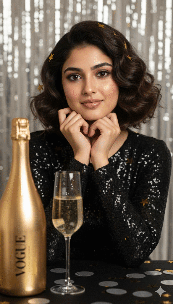New Year 2026Happy New Year 2026 Photo Prompt3 views0 likes0 copies✏️ Edit prompt before runningMaintain the same face and person, create a hyper-realistic portrait of a stunning young woman with shoulder-length dark brown hair styled in voluminous, retro-inspired wavy curls. The subject has a soft, captivating expression, looking directly into the camera with a gentle smile, brown eyes, defined eyebrows, and flawless glam makeup featuring smoky eye shadow and glossy nude lips. She is leaning forward, resting her chin comfortably on her clasped hands, her fingers interlaced near her cheek. She is wearing a sparkling black sequined long-sleeve dress or top that reflects the light. Gold star-shaped confetti pieces are playfully stuck in her hair, on her shoulder, and scattered on her clothing. In the immediate foreground to the left, there is a large, out-of-focus gold metallic champagne bottle with vertical text reading “VOGUE” visible on the side. Next to it, slightly off-center, stands a champagne flute filled with sparkling wine, also slightly blurred by the depth of field. The scene is set against a backdrop of a shimmering silver tinsel fringe curtain, creating vertical metallic lines and bokeh highlights. The table surface in the foreground is black, scattered with gold stars and large round silver confetti. The lighting is warm and cinematic, emphasizing the golden and silver tones for a festive, glamorous New Year’s Eve party atmosphere. 4k quality DSLR, ultra-detailed, high-resolution, sharp focus on the face, shallow depth of field, professional photography style.1521 charactersCopy PromptShareRun in ChatGPTRun in Gemini