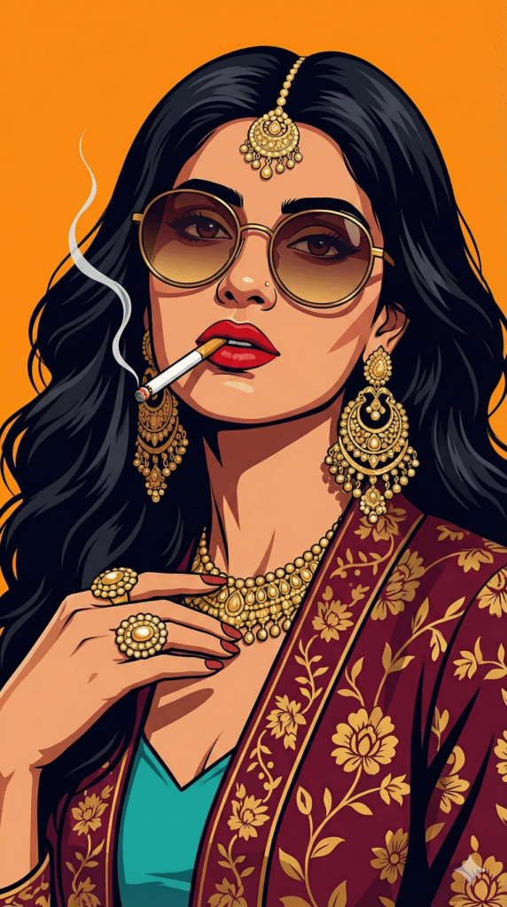 Digital IllustrationQueen Vector Art Illustration in Pop Art Aesthetic4 views0 likes0 copies✏️ Edit prompt before runningMaintain the same face and person, creating a high-quality digital vector illustration in a bold, stylized aesthetic reminiscent of Grand Theft Auto loading screen art or sophisticated pop art. The subject is a confident young woman with light brown skin and voluminous, long dark wavy hair cascading over her shoulders. She is wearing large, round, gradient-tinted sunglasses and has a lit cigarette dangling nonchalantly from her bold red lips, with a thin trail of white smoke rising upwards. Her attire is a fusion of traditional and modern luxury, featuring a deep maroon robe or jacket with golden floral leaf patterns on the sleeves, layered over a bright turquoise teal top or scarf. She is heavily adorned in intricate gold jewelry, including a maang tikka on her forehead, massive ornate chandelier earrings, a heavy detailed gold necklace, and a large statement ring on her hand which is raised delicately near her chest in a relaxed gesture. The lighting is sharp and illustrative with defined hard shadows under the jawline and on the neck to emphasize the graphic style. The background is a flat, solid, vibrant orange that makes the subject pop. The image should be ultra-detailed, with clean lines, rich saturated colors, high contrast, and a cinematic, cool ‘mafia queen’ atmosphere, 4k resolution, sharp focus.1340 charactersCopy PromptShareRun in ChatGPTRun in Gemini