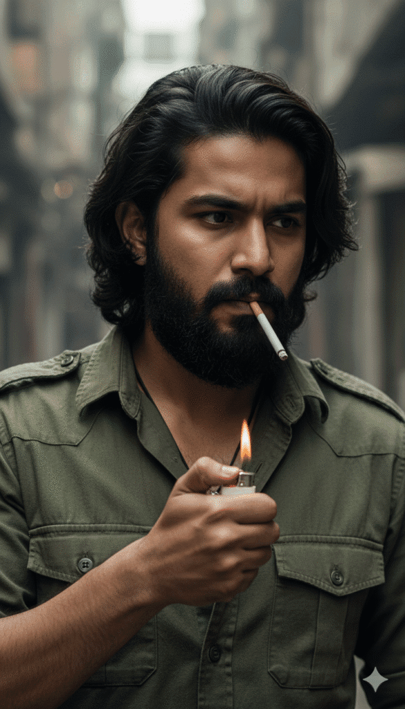 BollywoodDhurandhar Ranveer Singh Monster Look – Cinematic Portrait27 views0 likes0 copies✏️ Edit prompt before runningMaintain the same face and person, create a hyper-realistic portrait. Use this face and create a realistic HD high quality portrait of a rugged man with long, wavy dark hair and a thick, full beard and mustache. He is captured in a cinematic, medium close-up shot, in the act of lighting a cigarette held between his lips with a white lighter in his right hand, the small orange flame clearly visible. He has a serious, intense expression and is looking sharply to the side. He is wearing a textured olive green military-style shirt with shoulder epaulets and a dark necklace. The background is a blurred, gritty urban setting with muted grey tones, suggesting an alleyway or industrial area with out-of-focus wooden structures, creating a dramatic and moody atmosphere. The image should be 4k quality DSLR, highly detailed, with a shallow depth of field that keeps the focus sharp on the subject’s face and the action of lighting the cigarette.951 charactersCopy PromptShareRun in ChatGPTRun in Gemini