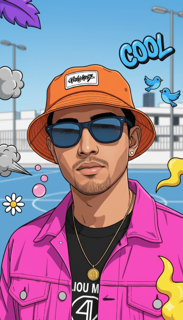 instagramCel-Shaded Urban Portrait in Vibrant GTA Style4 views0 likes0 copies✏️ Edit prompt before runningMaintain the same face and person, create a highly detailed, stylized portrait of a young man with light brown skin, a sharp jawline, and a cool, neutral expression. He is wearing a bright orange bucket hat with a white rectangular text label patch on the front, dark wayfarer-style sunglasses with blue reflective lenses, and a small diamond stud earring in his left ear. Around his neck is a thin gold chain with a round medallion pendant. He is dressed in a vibrant hot pink denim-style jacket that features distinct black comic-book style outlines and cel-shaded blue highlights to give it a 2D illustrative look, layered over a black t-shirt with partial white text visible reading “IOU M” and a central graphic logo. The visual style is a unique blend of hyper-realism and cel-shaded anime or “GTA loading screen” art, characterized by bold contour lines on the clothing and vibrant, saturated colors. The background is a bright, sunny outdoor urban setting, featuring a blue surface resembling a basketball court and blurred white city buildings and streetlights in the distance. The composition is framed by whimsical, floating 2D graphic elements: stylized purple leaves and branches in the top corners, a cartoonish grey cloud puff trail on the left, pink bubbles and a daisy flower, two small blue birds flying in the sky, and yellow wavy smoke shapes on the right. The lighting is harsh daylight creating strong contrasts, rendered in 4k quality, ultra-detailed, digital art masterpiece style.1529 charactersCopy PromptShareRun in ChatGPTRun in Gemini