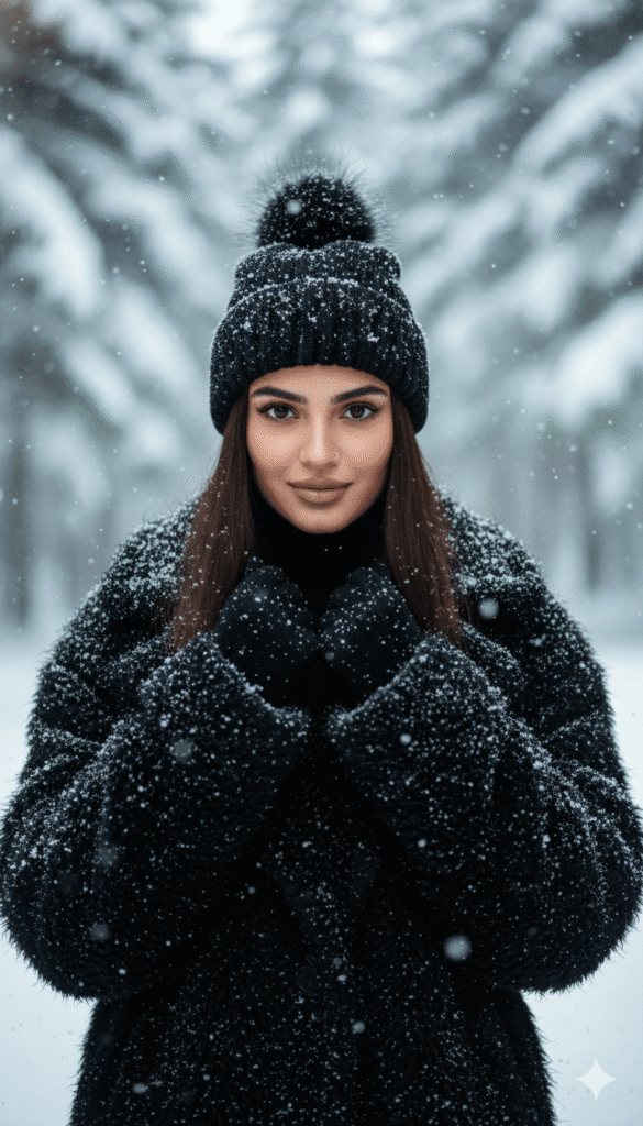 instagramWinter AI Prompts Snow Photo Trend3 views0 likes0 copies✏️ Edit prompt before running100% matching with the same face and person, create a hyper-realistic portrait of a beautiful young woman standing outdoors in a snowy winter setting. She has a smooth, light-to-medium complexion, captivating brown eyes with defined eyelashes, sculpted eyebrows, and full lips wearing a matte nude-mauve lipstick. Her expression is a calm, subtle smile as she looks directly at the camera. Her long, straight dark brown hair frames her face. She is wearing a black knitted beanie with a large, fluffy pom-pom on the left side; the hat is dusted with real snowflakes. She is bundled up in a unique, heavy black coat with a highly textured, shaggy, fibrous surface resembling distressed wool or faux fur, which captures the falling snow beautifully. Her hands are pulled inside her long black sleeves, held up near her chest in a cozy, defensive posture against the cold. The background features a soft, bokeh-blurred forest scene with evergreen trees heavily laden with thick white snow. The lighting is soft, diffuse, natural daylight, typical of an overcast snowy day, casting no harsh shadows on her face. The image is ultra-detailed, 8k resolution, shot with a portrait lens to create a shallow depth of field, highlighting the sharp contrast between the dark textured clothing and the bright white winter environment.1321 charactersCopy PromptShareRun in ChatGPTRun in Gemini