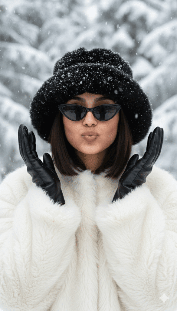 instagramWinter Season Photo Prompt Aesthetic AI2 views0 likes0 copies✏️ Edit prompt before runningMaintain the same face and person, create a hyper-realistic portrait of a stylish young woman posing outdoors in a snowy winter wonderland. The subject is a female with fair skin and dark, straight, shoulder-length hair, making a playful pouting “kissy face” expression. She is wearing a large, fuzzy black textured hat, similar to a bucket hat or beret, which is dusted with visible white snowflakes. She wears small, black, retro-style cat-eye sunglasses positioned low on the bridge of her nose so her eyes are visible peering over the rim. She is dressed in a voluminous, high-quality white faux-fur coat with a thick, vertical texture. Her hands are raised in front of her chest, framing her face with palms facing inward, wearing sleek black leather gloves. The background is a bright, white winter scene featuring a forest with trees and bushes heavily laden with thick snow and hoarfrost, creating a soft, blurry, monochromatic backdrop. The lighting is natural, soft, and diffused, consistent with an overcast snowy day, with gentle snowflakes falling in the air. The image quality should be 4k, ultra-detailed, photorealistic, with sharp focus on the subject and a high-fashion social media aesthetic.1223 charactersCopy PromptShareRun in ChatGPTRun in Gemini