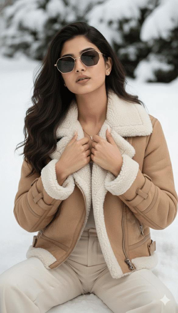 instagramWinter Season Photo Prompt Aesthetic2 views0 likes0 copies✏️ Edit prompt before runningMaintain the same face and person, create a hyper-realistic portrait of a stylish young woman sitting outdoors in a winter landscape. The subject has long, voluminous, wavy dark brown hair cascading over her shoulders and framing her face. She has a fair to light tan complexion and is wearing distinctive geometric, dark-tinted sunglasses with thin gold metal frames. Her expression is neutral and chic, with lips slightly parted in a soft, natural mauve tone. She is dressed in a fashionable beige or camel-colored shearling aviator jacket made of suede-like material, featuring thick, curly cream-colored faux fur lining visible at the cuffs, hem, collar, and along the seams. She is wearing light cream or off-white wide-leg trousers. Her hands are raised to her chest, gently grasping and adjusting the lapels of her jacket as if bundling up against the cold; her fingernails are long and manicured in a light shade. The background is a snowy winter scene with deep piles of fresh white snow covering the ground and heavy layers of snow resting on dark green evergreen bushes and trees behind her. The lighting is soft, diffused, and natural, typical of an overcast winter day, creating even illumination on her face and clothes without harsh shadows. The overall aesthetic is high-end fashion photography, 4k quality, ultra-detailed, sharp focus, capturing the texture of the shearling and snow, with a cool, serene, and stylish atmosphere.1446 charactersCopy PromptShareRun in ChatGPTRun in Gemini